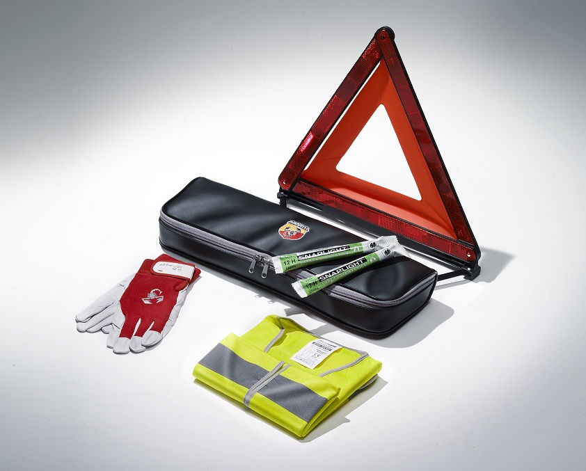Este kit incluye los siguientes elementos: Chaqueta amarilla de alta visibilidad con la marca Abarth Guantes de trabajo con la marca Abarth Triángulo de advertencia Barra de luz de seguridad Snaplight x2