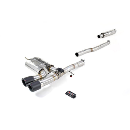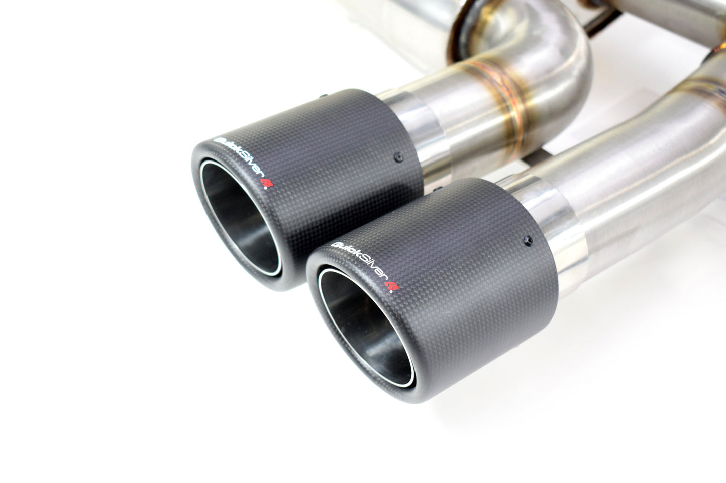 Our system is Mandrel bent from type 304 Stainless Steel. The bore size is 76mm throughout featuring a resonated section at the front. Towards the back the system splits via the valve. When the Valve is shut the gases pass through a rear silencer to mute the sound to an appropriate level, when opened however the gases primarily choose the path of least resistance in the form of our straight pipe section. To define to look these systems have our genuine carbon fibre QS tail pipes. |